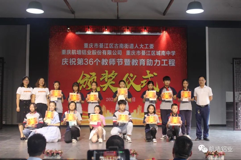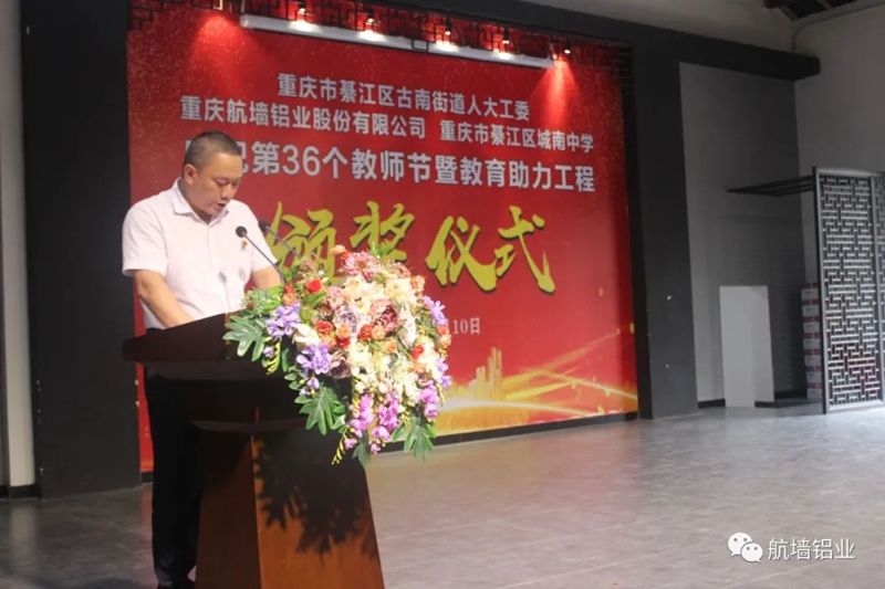 2020年9月10日,重慶航墻鋁業股份有限公司董事長藺勇帶上溫馨的祝福,帶上濃濃的關懷,參加了重慶市綦江區城南中學舉行“慶祝第36個教師節暨教育助力工程頒獎儀式”。