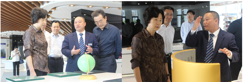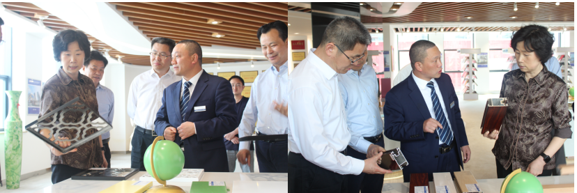 來到公司展廳,董事長為領導們介紹了公司的發展情況,組織架構,產品用途、性能、工藝、以及與傳統裝飾材料比較的優勢和工程案例,張軒主任對產品非常感興趣。